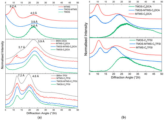 Patterns characteristic of ILs can also be observed in the XRD data of the ionogels (Figure 6). For the ionogels comprising BMIm DCA, the halo at ~23 °2θ was broader than that for the bare SiO2, which was due to its superposition with the scattering from the ionic liquid. In the XRD patterns of the ionogels comprising BMIm TFSI, both halos characteristic of BMIm TFSI were present. In the XRD pattern of the MTMS-C4DCA ionogel, the peak, at ~10 °2θ, was also present, indicating the preservation of Si–CH3 hydrophobic channels in the structure of MTMS-derived ionogels. Interestingly, in the MTMS-C4DCA ionogel, the characteristic size of these channels (~7.6 Å) was smaller than that of the bare silica (9.2 Å), presumably indicating their contraction in the presence of the hydrophilic ionic liquid.