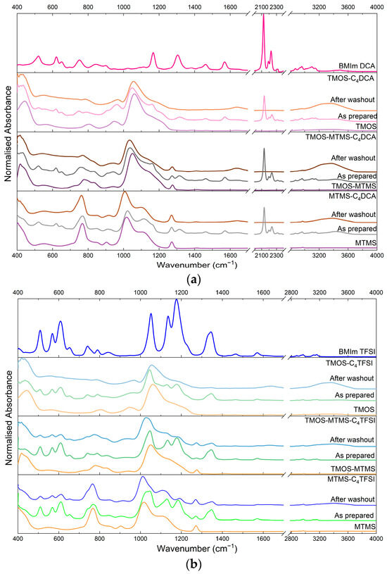 FTIR data (Figure 7, Tables S3 and S4) confirmed that, after contact of the ionogels with water, the ILs were washed out. For the ionogels containing BMIm DCA, almost no bands inherent in IL (see for example, the most intense ν(C≡N) vibrations at 2126 cm−1 and 2192 cm−1) were registered after the washout experiments, indicating the almost complete removal of the IL. For the ionogels containing BMIm TFSI, most of the IL vibration bands were still present in the spectra of the washed-out samples (e.g., anion-specific bands at 568 cm−1, 608 cm−1, 653 cm−1 and 790 cm−1 and cation-specific bands at 3162–3169 cm−1), while their intensities were significantly lower than those for the as prepared ionogel samples. After washout, the ionogels synthesised using MTMS and BMIm TFSI (TMOS-MTMS-C4TFSI and MTMS-C4TFSI) samples showed the highest intensities of the bands inherent in the IL, e.g., vibrations at 1189–1194 cm−1 (δ(H–C–C) and δ(H–C–N) in the imidazolium ring) and 767–780 cm−1 (S–N–S stretching in the imidazolium ring). Note that the aforementioned bands were not registered in the spectra of the TMOS-C4TFSI sample with the hydrophilic silica matrix. The overall FTIR dataset indicated that IL washout can be hindered by hydrophobisation of the ionogels, either by the use of low-soluble ionic liquids, or the incorporation of hydrophobic silica moieties (Si-CH3) in their structure.