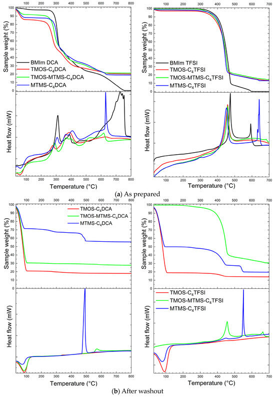 Thermal analysis (Figure 8) showed a very high level of water content in most of the ionogels after washout: they lost 29–81% of their weight after heating to 100 °C. Predictably, the most hydrophobic sample, TMOS-MTMS-C4TFSI, after the washout showed almost no weight loss associated with water removal after heating. The IL decomposition stage, which is manifested by weight loss at 200–700 °C, accompanied by an exo-effect, was observed for the most hydrophobic samples only, namely MTMS-C4DCA and the ionogels containing BMIm TFSI. Note that the TMOS-MTMS-C4TFSI ionogel showed the greatest weight loss in the second stage (~70 wt.%), indicating the highest IL content.