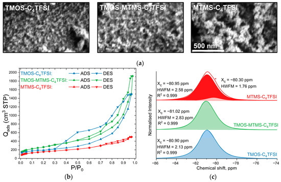 The samples were characterised using complementary methods, including helium pycnometry, water contact angle measurements, nitrogen adsorption [51,52,53], XRD, FTIR, TGA, NMR and SEM. For the experimental details, see the “Analysis of ionogels” section in the Supplementary Materials.