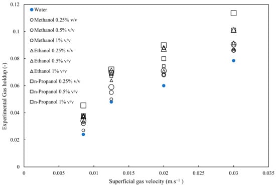 In corresponding and alcohol concentrations, . In n-propanol, the solution is more than the methanol solution, the methanol solution is more than the ethanol solution, and this solution is more than water. These results are supported by the literature [,]. As confirmed by many researchers, this is because increasing alcohol concentration in an aqueous solution leads to a reduction of surface tension, and hence, gas bubbles become more rigid, and bubble rise velocity decreases. The presence of alcohol in the system reduces the tendency of bubbles to interconnect and leads to the maintenance of a homogeneous flow regime and the production of small bubbles. As a result, an almost linear increase in gas holdup is associated with an increase in air velocity [].