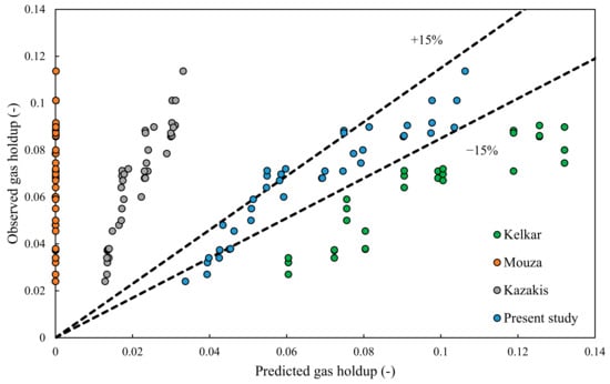 Present work experimental gas holdup vs. predicted gas holdup by using Equations (1)–(3) and (16).