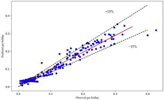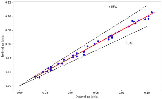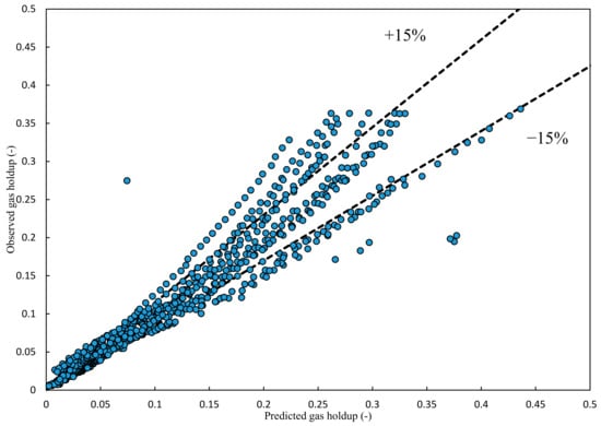 The R2 of Equation (16) was 0.96, meaning that this equation can predict the gas holdup with high accuracy, and its mean standard error was estimated to be 0.0377. It should be noted that the accuracy of this equation is valid when the input data is within the range of data in which the correlation was generated; the relationship observed may not be accurate if being extrapolated. It is expected that the further one is from the known data, the less reliable the prediction becomes. To verify the correlation obtained in Equation (16) and compare it with correlations from previous research (as presented in Table 1), the data gathered from the present work’s experiment, as shown in Figure 2, was used. This dataset was called ‘blind points’, meaning it was new for both Equation (16) and the correlations from previous studies. Figure 3 shows the accuracy of all the correlations used in this research, with an error margin of ±15%.