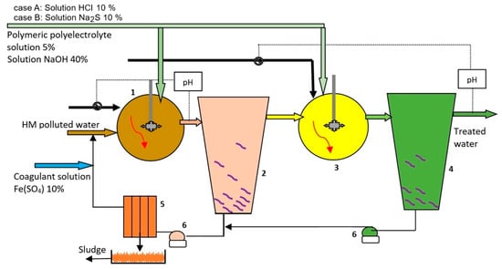 The sulfides’ working procedure is a modification of hydroxides precipitation treatment technology for HM removal from WW, illustrated in Figure 3, case B, where sodium sulfide solutions are used as precipitating agents.