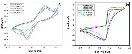 Cyclic voltammograms of a Pt electrode in: (a) 1 M of vanadium electrolyte with different concentrations of H2SO4, (b) 0.6M Ce(CH3SO3)3 + 4M MSA + x M H2SO4.