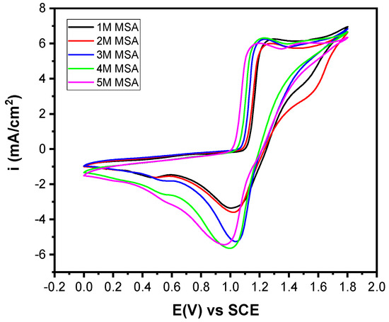 Cyclic voltammograms of a Pt electrode in 0.6 M Ce(CH3SO3)3 + x M MSA (x = 1, 2, 3, 4, 5).