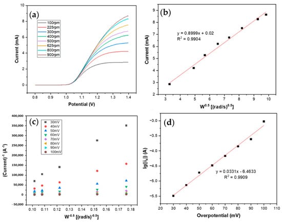 (a) Linear sweep voltammetry of 0.6 M Ce(CH3SO3)3 + 4M MSA + 0.5 M H2SO4 + 2% mol L-Lysine electrolyte with different rotation speeds at a scan rate of 5 mV/s. (b) Levich plot of limiting current versus the square root of the rotation rate (ω1/2). (c) Koutecky–Levich plot at different overpotentials. (d) Tafel plot of the logarithm of kinetically limited current versus overpotential.