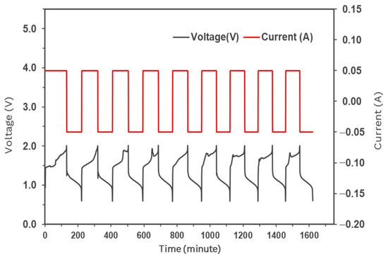 Figure 7 illustrates the charge and discharge curves of the V-Ce flow battery with a concentration of 1 M for both vanadium and cerium ions (V and Ce3+, respectively). The current during charging is maintained at 0.05 A; during discharging, it is maintained at −0.05 A. The voltage is limited to within the range of 2 V and 0.6 V. As Figure 7 shows, voltage does not continuously increase; however, with more charge/discharge cycles, the voltage begins increasing continuously. Normally, this phenomenon is specific for single and small RFB cells because of the effect of liquid flows during the pumping process. In addition, the system is homogeneously low for several of the first cycles, which could be due to the interaction of the electrolytes (both catholyte and anolyte) with electrodes and also the time needed for stabilizing redox pairs in the catholyte and anolyte. By combining various RFB stacks and/or by using big RFB cells, this issue should be resolved and the voltage should be increasing continuously [1,2,6,9,10].
