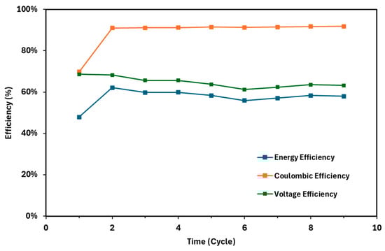 Figure 8 illustrates the efficiency of a redox flow battery over 9 cycles, focusing on energy efficiency, Coulombic efficiency, and voltage efficiency. The Coulombic efficiency value remains consistently high at around 90%, indicating efficient charge storage and retrieval processes with minimal side reactions. Both energy and voltage efficiencies stabilize between 50% and 60% after the initial cycles, demonstrating stable operation over time, despite moderate inefficiencies. The voltage efficiency, reflecting losses due to overpotentials and internal resistance, is notably lower than the Coulombic efficiency, highlighting voltage-related losses as a key area for improvement. Potential enhancements include reducing the internal resistance through better electrolyte conductivity and electrode design, optimizing redox reactions to minimize overpotential, and employing advanced materials for the electrodes and membranes to improve overall efficiency and battery lifespan.