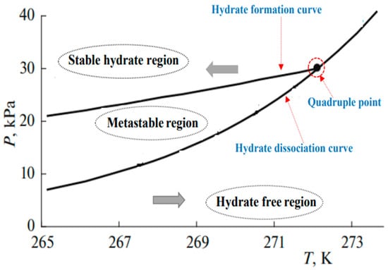 The chemical inhibition of gas hydrates requires an understanding of their thermodynamic and kinetic characteristics. The thermodynamic stability of gas hydrates is affected by factors such as temperature, pressure, gas composition, and condensed phase composition (which involves hydrocarbon in the liquid phase, salt content, and the chemical inhibitor) []. In thermodynamic gas hydrate inhibition, determining the temperature and pressure conditions at which the flow system would be inside the hydrate stability zone and assessing the settings surrounding gas hydrate dissociation are crucial. Figure 2 depicts the pressure and temperature profile to which a typical fluid can be subjected to inside a flow system. The hydrate formation occurs in the stable hydrate zone. The addition of a thermodynamic inhibitor in the pipeline can cause the hydrate stabilization zone to migrate to lower-temperature and higher-pressure conditions. The kinetics of hydrate growth are a complicated process, in contrast to the thermodynamic characteristics of gas hydrates. Several kinetic factors can impact the nucleation and development of hydrates, and consequently the dissolution of hydrates in water–gas systems []. The driving forces, which include temperature and pressure, composition, and interfacial area, are some examples of these factors [].