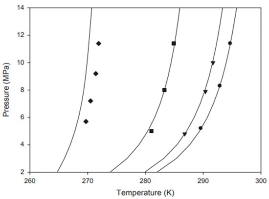 Three primary procedures (isothermal, isobaric, and isochoric, respectively) were developed for experimental phase equilibrium condition measurements [,]. The isothermal approach keeps the system temperature constant, and the equilibrium pressure is established by visually observing the disappearance of the hydrate. In the isobaric approach, the equilibrium temperature is determined by visually observing the hydrate’s disappearance while maintaining a constant system pressure. The isochoric approach maintains a constant volume while changing the pressure with temperature and phase change. Since the hydrate dissociation points are found using a pressure vs. temperature plot, the isochoric approach does not require visual observation. The hydrate phase equilibrium conditions are frequently measured using non-visual procedures in most studies [].