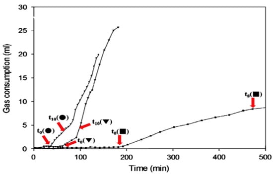 Curves of synthetic gas mixture usage during hydrate formation: pure water (●); 10.0 wt% MEG solution (▼); 30.0 wt% MEG solution (■). The time at which the hydrate equilibrium temperature is reached is known as the time origin [].
