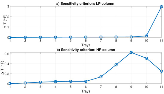 - Temperature control tray selection:The tray control temperature was selected using the criteria described in Luyben [38]. Figure 10 shows the nominal values of the temperatures in the trays of each column in the Figure 10a,b. These profiles were used in each criterion: