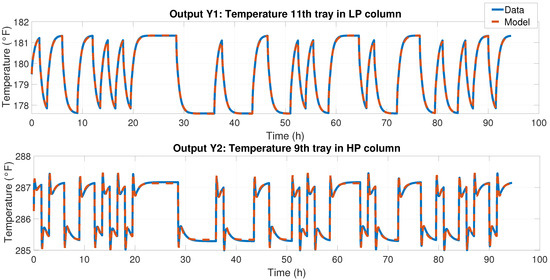 Table 11. Results of the sensitivity analysis carried out for the primary variables of the process.With the results reported in Table 11, it could be concluded that the compositions of the bottom products had strong interactions with more than one variable. Therefore, it was decided to implement a MIMO MPC controller to control these primary variables and a PI controller to control the pressure of the low-pressure column (LPC).One of the ways to control the composition is to do it indirectly to avoid the need to measure the composition. Temperature control was performed instead of a composition control. For this indirect control to work correctly, a constant reflux relationship must be maintained in the process [37]. Therefore, it was necessary to regulate the reflux relations, and to do so, the following was undertaken: To keep the reflux ratio (RR) constant, the Aspen Plus Dynamics simulator used a block called Multiply that maintained the relationship between two inputs and one output. The two inputs were the total distillate mass flow rate of the low-pressure column and the RR value of 0.40722, and the output was the reflux mass flow rate of the low-pressure column. The high-pressure column had the same inlets and outlets, but with an RR of 0.152835.Figure 9 shows the process flow diagram incorporating these controllers within the simulator. The controllers used to maintain constant reflux are indicated by RR1 and RR2. This regulation allowed the composition to be controlled indirectly by regulating the temperature in a dish.