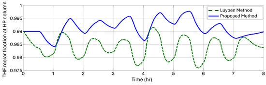 Also, the THF–water separation processes have several variables that must be controlled, such as pressure, heat, and/or reflux ratios, as presented in [29]. They presented dynamic control of the reflux ratio and reboiler heat duty. Additionally, they added a thermal integration process. In [30], a heat integration and dynamic control strategy of reactive pressure-swing distillation to separate the mixture was applied. In [31], a dynamic controllability study was applied to extractive and pressure-swing distillation; they controlled the feed flow, pressures, reflux drum levels, and temperatures in trays using PI controllers.