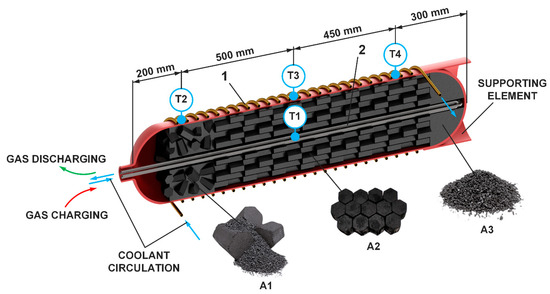 Sectional view of the ANG storage tank design. Designations: 1—twisted external heat exchanger; 2—internal heat exchanger in the form of two U-shaped tubes; A1–3—zones of the adsorption layer with different structures; T1–4—temperature sensors.