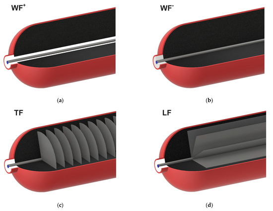 In the first and second options, the thermal control in the adsorber was carried out with the aid of an internal heat exchanger without fins (Figure 2a,b), which was located along the axis of the ANG storage tank in the form of an aluminum through tube with an outer diameter of 18 mm, an inner diameter of 14 mm, and a length of 1450 mm (corresponding to the length of the adsorbent layer), through which a flow of ethanol circulated. The cross-section of the tube is equivalent to the cross-section of two U-shaped tubes of the internal heat exchanger of the full-scale experimental sample of the ANG storage tank (Figure 1). The first option (WF+ thermal control system) differs from the second (WF− thermal control system) by the presence of a cylindrical cavity with a diameter of 40 mm between the internal heat exchanger and the adsorbent layer. In the second option, the heat exchanger is in direct contact with the surface of the adsorbent along the entire length of its layer. In the third option (TF thermal control system), the same heat exchanger additionally has 25 fins (Figure 2c) transversely located relative to the adsorption accumulator axis, 130 mm high and 1 mm thick with a pitch of 48 mm. And in the fourth option (LF thermal control system), the heat exchanger (Figure 2d) is equipped with ten longitudinally located fins with a pitch of 36°, 130 mm high, 1 mm thick, and 1150 mm long. The geometric parameters of the transverse and longitudinal finning were calculated in such a way as to ensure the same contact area of the fins with the adsorbent. The volume occupied by the transverse fins is equal to the volume occupied by the longitudinal fins. The fins are located only within the cylindrical part of the adsorption accumulator. The height of the fins was set in such a way as to provide a gap between the periphery of the fins and the walls of the ANG storage tank for free gas flow.