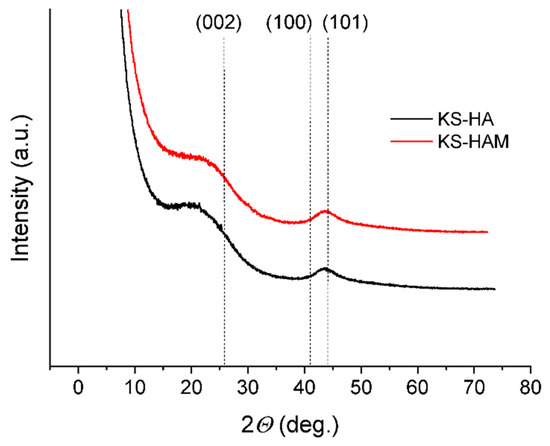 The phase composition of the initial granular activated carbon KS-HA and the monolithic adsorbent KS-HAM obtained on its basis was studied by the PXRD method on an Empyrean Panalytical diffractometer (Panalytical BV) in Bragg–Brentano geometry using Ni-filtered CuKα radiation (λCu = 0.1542 nm). Radiographs were obtained in a range of 2θ scanning angles of 10 to 90 degrees. Phases identified using the ICDD PDF2 database.