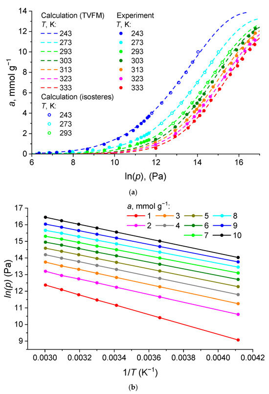 We used TVFM equations [53] to evaluate methane adsorption in micropores. To determine adsorption at temperatures that do not correspond to experimental ones, the linearity property of isosteres at a = const, which were plotted in coordinates 1/T − lnP, was used.