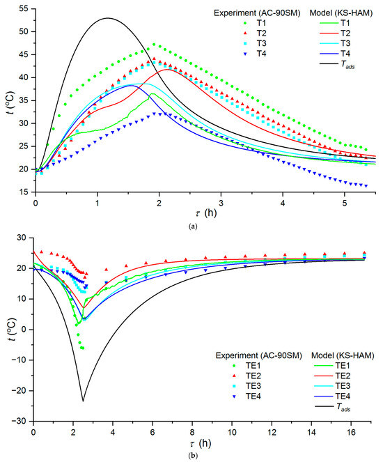 In the case of the WF− thermal control system (Figures S7c,d, S8c,d, S9c,d and S10c,d of the Supplementary Materials), a more pronounced influence of the heat exchanger is observed due to its direct contact with the adsorption layer.