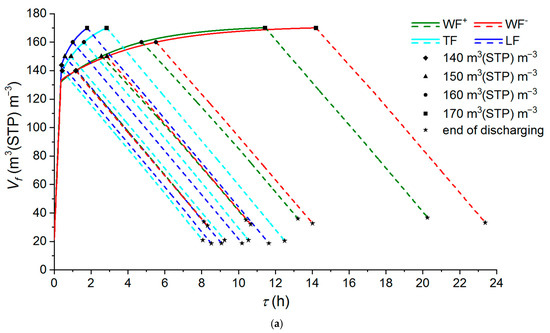 During temperature-controlled charging of the ANG storage tank with the WF+ thermal control system, it can be seen that the rear part of the adsorption accumulator cools down more than the side with the inlet gas pipe (Figures S5a,b and S6a,b of the Supplementary Materials). Similar behaviors of the thermal field can be observed in the system described in [56], as well as in experimental studies of the adsorption accumulator without an internal heat exchanger [9]. The absence of a gas channel results in the front part of the ANG storage tank with the WF− system being cooled more than the rear, which is especially noticeable when charging the system to 140 m3(STP) m−3 (Figure S5c of the Supplementary Materials) and 150 m3(STP) m−3 (Figure S6c of the Supplementary Materials). A similar temperature distribution was observed for the ANG storage system with a continuous homogeneous layer of carbon adsorption material, without an internal heat exchanger [30]. However, in the case of charging up to 160 m3(STP) m−3 (Figure S6d of the Supplementary Materials) and 170 m3(STP) m−3 (Figure S5d of the Supplementary Materials), it can be seen that, over time, the thermal front gradually shifts to the rear of the adsorption accumulator. For the case of charging the ANG storage tank with TF (Figures S5e,f and S6e,f of the Supplementary Materials) and LF (Figures S5g,h and S6g,h of the Supplementary Materials) thermal control systems, the opposite picture is observed, where the rear part of the adsorption accumulator heats up more than the front. A similar behavior of the 2.2 L adsorption accumulator with an internal heat exchanger with transverse fins was demonstrated in [6].
