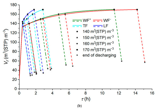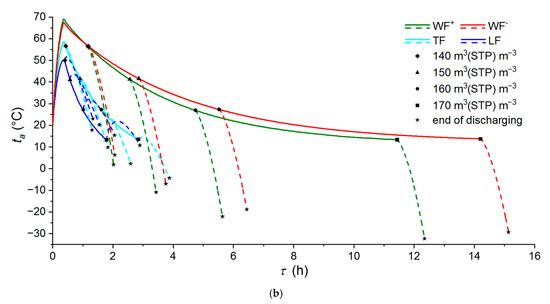 In turn, at the gas-discharging flow rates of 4 kg h−1 (Figure S4b of the Supplementary Materials) and 8 kg h−1 (Figure 12b), there is no excess heating and, as a consequence, no increase in pressure in the ANG storage tank. Thus, according to Table S3 of the Supplementary Materials, when using the LF thermal control system, the average wall temperature of the storage tank at the end of the charging–discharging cycle varies in the range from 6.9 to 33 °C depending on the initial storage capacity after charging, and for the WF− system, temperatures from −5.2 to 17 °C are typical. It is important to note that negative wall temperatures can lead to icing of the adsorption accumulator or condensation on its surface, which must also be taken into account when designing the ANG storage systems.
