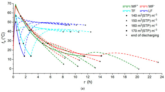 With sufficiently intensive thermal control (especially for the LF system), the final temperatures of the adsorbent during discharging (Figures S7–S10 of the Supplementary Materials) differed significantly less from each other than the initial temperatures corresponding to different levels of storage capacity after charging (Figures S5 and S6 of the Supplementary Materials). The difference in the temperature of the adsorption layer is almost imperceptible for the TF and LF systems (no more than 1.7 °C) at relatively low gas discharging flow rates (up to 2 kg h−1). However, it begins to appear at 4 kg h−1 for the TF thermal control system (9.6 °C) and at 8 kg h−1 for the LF system LF (12.3 °C).