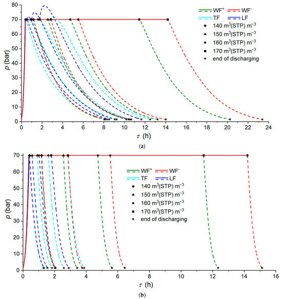 As seen from Figure 12a, at a gas-discharging flow rate of 1 kg h−1 with sufficiently efficient heating of the ANG storage tank with the LF thermal control system, there is a risk of exceeding the pressure to 79.4 bar, which is 13.4% higher than the charging pressure. However, in most of the modes considered, this excess is small and relatively safe. In practice, it is possible to limit heating when the pressure exceeds a certain limit. In some cases, the highly efficient heating of the system may limit practical application due to the potential heating of objects near the ANG storage system, especially when located in a confined space, such as in the trunk of a vehicle.