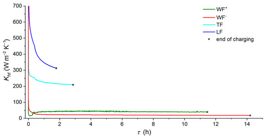 As can be seen from Figure 13 and Figure 14, as well as Figures S11–S13 of the Supplementary Materials, the heat transfer coefficients are predominantly asymptotic curves. High values at the beginning of the charging and discharging processes are due to the restructuring of the thermal field, and relatively constant values at the end of the processes correspond to a static thermal field with an established gradient (shape). As a simplification, we can consider the dynamic and static components of the heat transfer coefficient by analogy with [15].