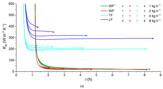 During the charging process of the ANG storage tank with TF and LF thermal control systems (Figure 13), the heat exchange mode with constant Kht was not achieved. The heat transfer coefficient values at the end of the process were 209 and 312 W m−2 K−1 for the TF and LF systems, respectively. For the WF+ system, the Kht value was 43 W m−2 K−1, while for the WF− system, it was only 18 W m−2 K−1.