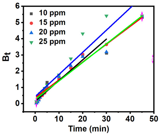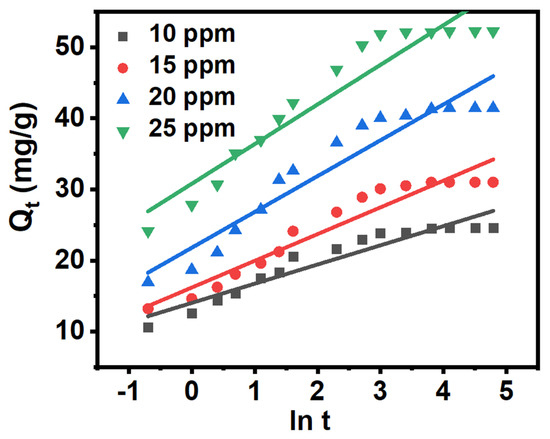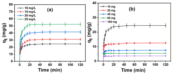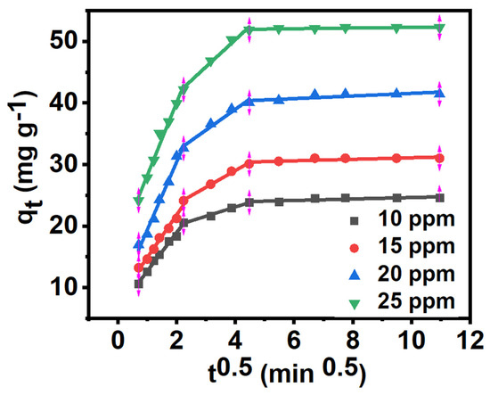 - qt—Amount of dye adsorbed at time t per unit mass of adsorbent (mg/g);