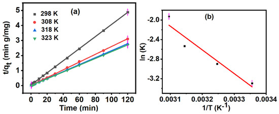 | Temperature (K) | Pseudo-Second-Order Rate Constant, K2 (g mg−1 min−1) | Qe (mg g−1) |