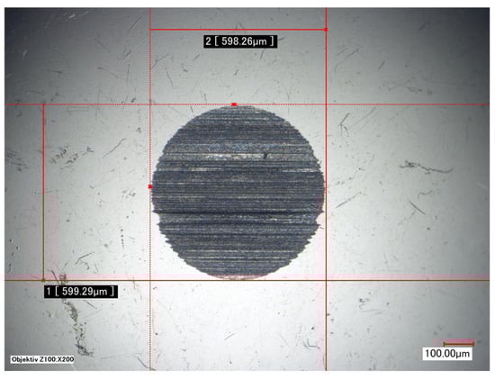 In addition to these two values, two others were examined with microscopes. These are wear parameters, which represent the wear of the test specimens. After measurements, the test specimens were soaked in naphtha and cleaned with an ultrasonic cleaner at 50 °C for 15 min to remove all contamination, wear debris, and leftover oil. The specimens were stored in a desiccator with a vapor absorber silica gel between the cleaning and microscopic measurements. Using a Keyence VHX-1000 (Osaka, Japan) digital microscope, the wear scar diameter (WSD value) on the ball specimen was determined. The diameter was measured by placing the ball specimen on an adjustable hemispherical ball holder and then on the microscope’s table. The microscope’s objective lens was zoomed in on the ball’s surface until it was focused. A magnification of 200 times was used for the measurement. The adjustment of the ball holder element has been fine-tuned until the wear scar is in the center. Subsequently, the microscope software scaled the centrally located wear scar in focus. The ISO 19291:2016 standard is used to evaluate the anti-wear properties of lubricants using a steel ball-on-flat surface wear test method, which determines the WSD. To determine the WSD value, measure the width and height of the wear scar on the ball in the direction of movement and then calculate the arithmetic mean of these two values to obtain the result (see Figure 1).