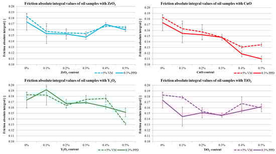 The friction absolute integral results of the tested oxide nanoparticles are shown with a dashed line for the lubricant sample containing 5% viscosity modifier and a solid line for the lubricant sample containing 0.3% pour point depressant. All y-axes are truncated at 0.1.