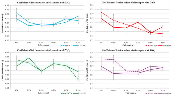 In addition to the viscosity modifiers and pour point depressants used in the oil samples, the nanoceramics mentioned above were used, too. The enhancing effect of nanoceramics has been proven. The nanoparticles’ size positively affected friction and wear, according to Dai et al. []. Nanoparticles can fill up surface roughness grooves, resulting in notable changes in surface morphology and increased contact between surfaces and nanoparticles []. They also contribute to the transition from sliding to rolling movement and help form a protective layer. Thanks to these repairing mechanisms, the nanoadditives doped into the oil can reduce wear and friction, thus increasing the lifetime of components [,]. The present study investigated four nanoadditives: copper (II) oxide, zirconium dioxide, yttrium oxide, and titanium dioxide. First, for copper (II) oxide, researchers performed tests with copper (II) oxide nanoparticles. Studies have shown that copper (II) oxide can reduce the coefficient of friction by 14.59–42.92% compared to the reference and also creates a film layer that reduces contact area and wear rate [,]. Another studied nanoparticle, zirconia, was investigated by Tóth et al. They found that the optimum percentage by weight of zirconium dioxide additive in oil is 0.4 wt%, where the additive produced the most favorable tribological properties []. Zirconia is often mixed with rare earth elements, such as yttrium, to minimize microcracking due to thermal stress, thus creating reliable molecular stability [,].