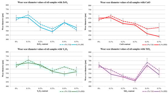 The mean wear scar diameter results of the balls tested with oxide nanoparticles are shown with a dashed line for the lubricant sample containing a 5% viscosity modifier and a solid line for the lubricant sample containing 0.3% pour point depressant. All y-axes are truncated at 400 µm.