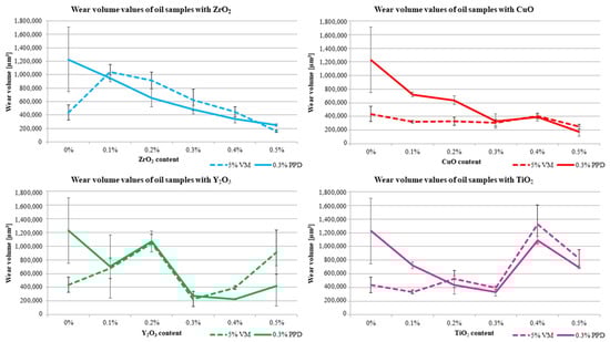 The wear volume results of the disks tested with oxide nanoparticles are shown with a dashed line for the lubricant sample containing a 5% viscosity modifier and a solid line for the lubricant sample containing 0.3% pour point depressant.