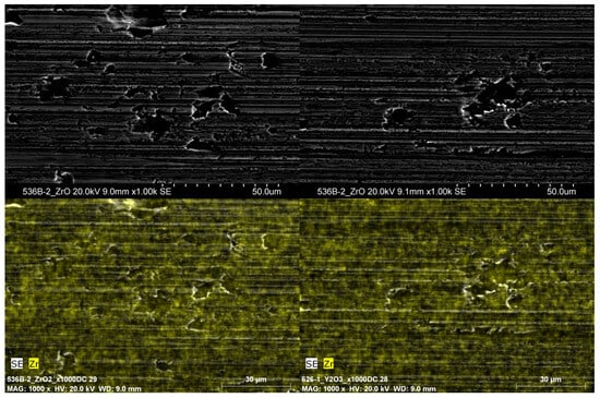 The EDX analysis of the wear mark (Figure 7, bottom row) reveals that zirconia is distributed almost uniformly across the entire wear mark, 0.67 norm.at% zirconium can be observed in the middle point. At the dead center point, more zirconia was incorporated into the surface, with the amount of zirconium found here being 1.09 norm.at%. Only a few smaller locations show noticeable zirconia enrichment. This zirconia-enriched tribofilm endowed the disc with good wear-resistant properties but could not eliminate the significant fatigue wear.