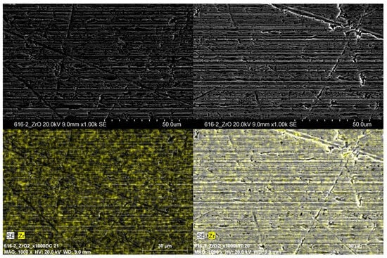 SEM and EDX images of the worn surface of the disc specimens tribotested with Group III + 5% viscosity modifier + 0.5 wt% zirconia nanoadditive. The photos were taken from the wear track dead center (left) and stroke-middle section (right) areas with the horizontal sliding direction. In the bottom row are the results of the EDX analysis of the same images, with the location of the zirconium element highlighted in yellow.