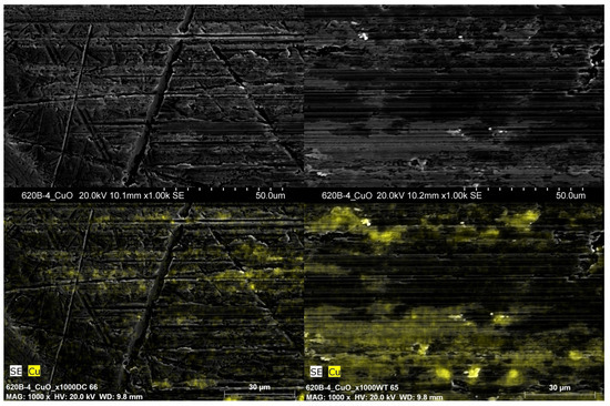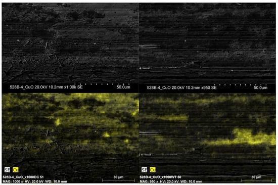 SEM and EDX images of the worn surface of the disc specimens tribotested with Group III + 5% viscosity modifier + 0.5 wt% cupric oxide nanoadditive. The photos were taken from the wear track dead center (left) and stroke-middle section (right) areas with the horizontal sliding direction. In the bottom row are the results of the EDX analysis of the same images, with the location of the copper element highlighted in yellow.