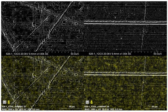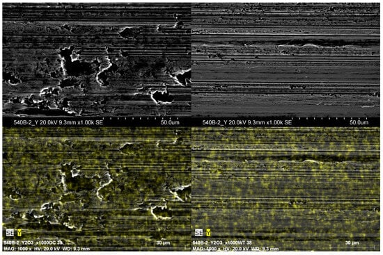 SEM and EDX images of the worn surface of the disc specimens tribotested with Group III + 5% viscosity modifier + 0.3 wt% yttria nanoadditive. The photos were taken from the wear track dead center (left) and stroke-middle section (right) areas with the horizontal sliding direction. In the bottom row are the results of the EDX analysis of the same images, with the location of the yttrium element highlighted in yellow.