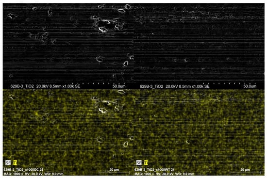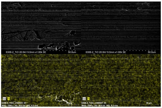 SEM and EDX images of the worn surface of the disc specimens tribotested with Group III + 0.3% pour point depressant + 0.3 wt% titania nanoadditive. The photos were taken from the wear track dead center (left) and stroke-middle section (right) areas with the horizontal sliding direction. In the bottom row are the results of the EDX analysis of the same images, with the location of the titanium element highlighted in yellow.