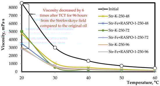 Reactive hydrogen from the hydrogen donor, represented by C4-155/205, during aquathermolysis can inhibit polymerization between low-molecular-weight radicals formed during cracking and reduce the viscosity of the oil [22]. Additionally, TCT can influence the decomposition and depolymerization of asphaltenes in the high-viscosity oil of the Strelovskoye field, which contributes to the reduction in oil viscosity.