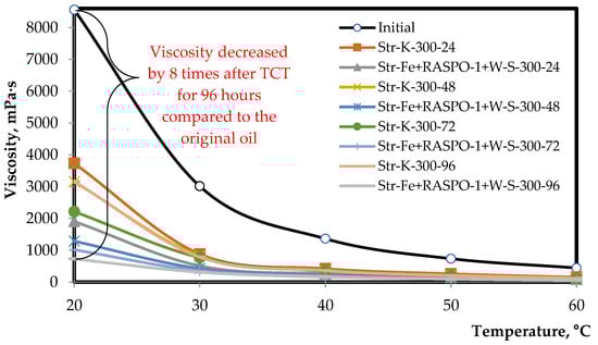 Viscosity–temperature characteristics of the initial oil and oil samples after thermocatalytic treatment (TCT) with and without iron catalyst at a temperature of 300 °C and varying treatment durations.