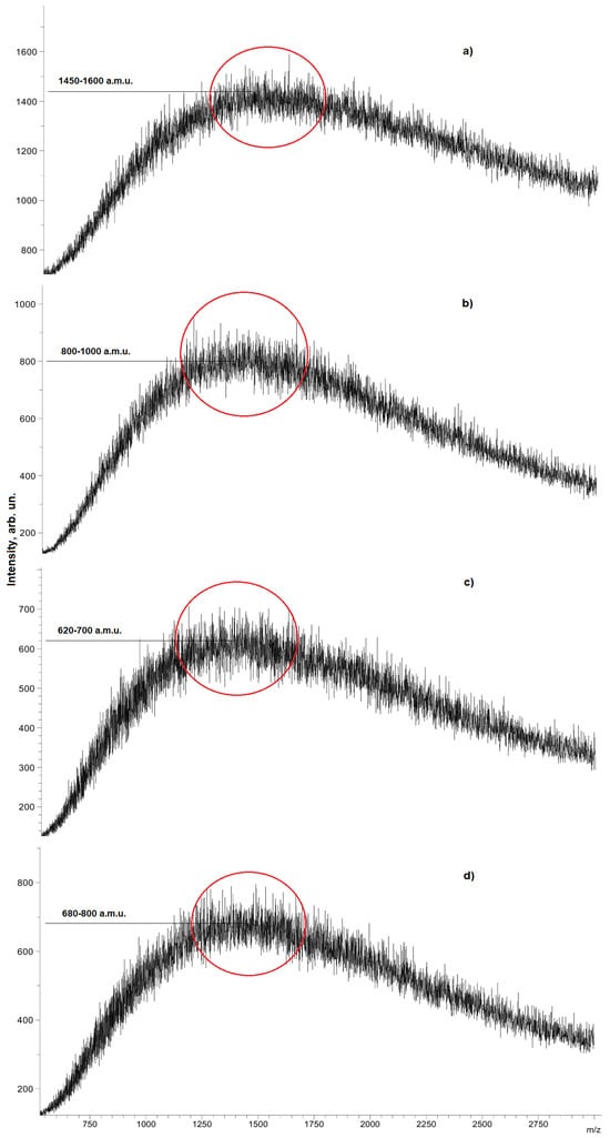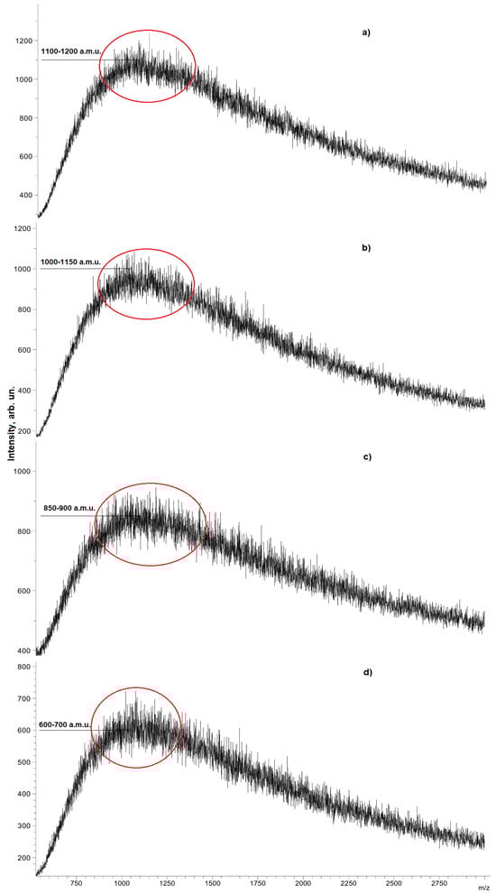 MALDI mass spectra of resins: (a) initial oil; (b) Str-K-300-96; (c) Str-Fe+RASPO-1+W-S-300-96; (d) Str-Ni+RASPO-1+W-S-300-96.