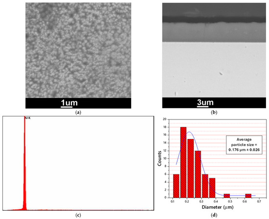 A uniform, adherent, and fine-grained Al layer was electrodeposited at 5 mA/cm2 from EMIC/AlCl3 IL (40/60 mol%) on steel substrate; see Figure 1. The microstructure of the planar outer surface (Figure 1a) showed that the Al layer deposited at –5 mA/cm2 is extremely fine-micro-structured, with a mean particle size of 0.176 ± 0.026 µm (Figure 1d). The cross-sectional micrograph showed good adhesion of the Al layer with the steel substrate (Figure 1b). Also, the EDX spectra of the deposited layer (Figure 1c) showed that its composition is pure aluminum. Ultra fine micro-structured, and sometimes nanocrystalline Al layers, were reported to be electrodeposited from chloroaluminate ILs at higher current densities [29,33].