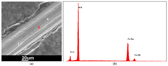 (a) SEM micrograph of the groove scratched mechanically on the Al-coated steel specimen; (b) EDX spectrum for point X, shown in the SEM micrograph in (a).