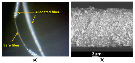 (a) Optical micrograph showing coated and non-coated segments of polymer fibers with Al; the non-coated segment was previously coated with lacquer before the electrodeposition experiment; (b) SEM micrograph of Al-electroplated fiber.