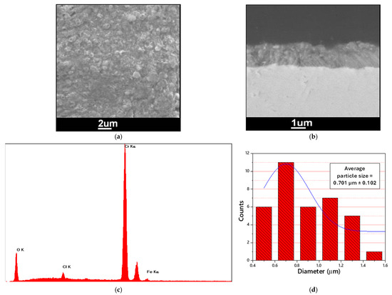 (a) SEM micrograph of the Cr thin layer, electrodeposited from “1 ChCl:2 CrCl3·6H2O” DES with 10% LiCl onto a mild steel sheet at CD = −0.5 mA/cm² and T = 60 °C for 2 h; (b) BS SEM cross-sectional micrograph of the Cr thin layer deposited onto a mild steel sheet; (c) EDX spectrum of the complete area of the Cr layer revealed in (a); (d) Particle size distribution histogram of the electrodeposited Cr layer.
