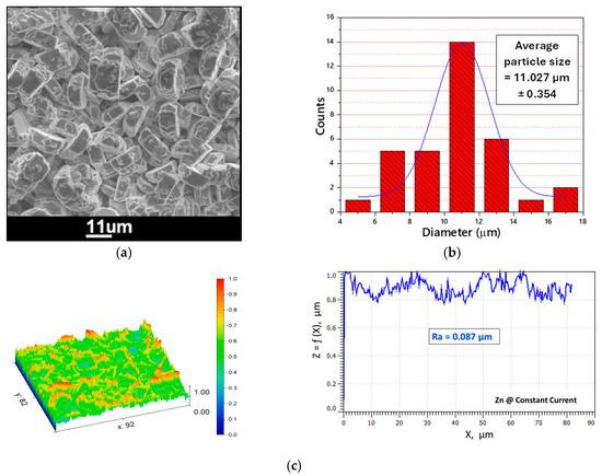 (a) SEM micrograph, (b) particle size distribution histogram, and (c) surface topography micrograph and roughness profile of Zn layer electrodeposited in the DES “1 ChCl:2 urea” at a constant current density of −5 mA/cm2 and 60 °C for 1 h.